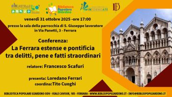 Venerdì 31 Ottobre 2025 ore 17presso la Sala parrocchiale San Giuseppe Lavoratore via Panetti 5 FerraraLa Ferrara estense e pontificia tra delitti, pene e fatti straordinari relatore Francesco Scafuripresenta Loredano Ferraricoordina Tito Cuoghi Scafuri, con l’ausilio di suggestive immagini, illustrerà al pubblico alcune vicende che videro protagonisti feroci assassini, ladri incalliti e donne accusate di stregoneria nel periodo […]