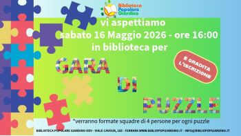 La Biblioteca Popolare Giardino organizza la seconda edizione diPUZZLEMANIA– Gara di Puzzle. sabato 16 maggio 2026 ore 16:00Presso la Biblioteca Popolare Giardino Viale Cavour 183, ai piedi del grattacielo. Una grande sfida per appassionati dove le squadre di partecipanti gareggiano contro il tempo per assemblare un puzzle il più velocemente possibile. Sono ammesse iscrizioni di singoli o di gruppi composti da un massimo […]