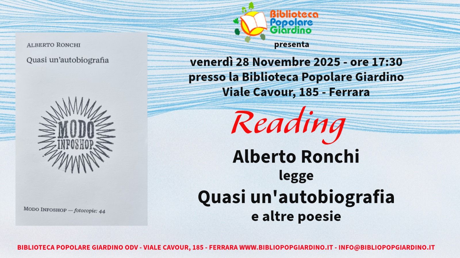 ALBERTO RONCHI legge “QUASI UN’AUTOBIOGRAFIA” e altre poesieVenerdì 28 novembre 2025 ore 17:30Presso Biblioteca Popolare Giardino viale Cavour 185 (ai piedi del Grattacielo) “In uno stile poetico molto diretto, influenzato sia da Bukowski sia dagli autori della Beat Generation, con tutto il rispetto per questi mostri sacri” come l’autore afferma, si ripercorrono gli anni della […]