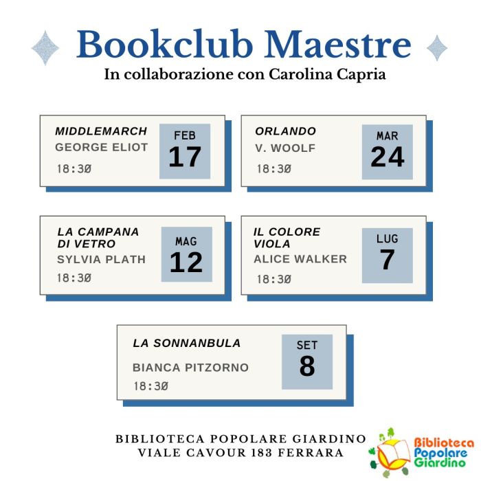 | Il bookclub “ Maestre” continua a Ferrara! L’appuntamento per il primo incontro è il 17 febbraio 2026 alle 18:30 presso la Biblioteca Popolare Giardino Questa iniziativa nasce da un’idea di Carolina Capria che, in occasione dell’uscita del suo libro “Maestre”, ha proposto di ampliare il raggio d’azione del suo bookclub, che dal 2019 si svolge in sede a Milano e online. Carolina Capria è conosciuta sui social per la sua pagina @lhascrittounafemmina, in cui si occupa di letteratura scritta da donne e di questioni di genere. Lo scorso anno, noi della Biblioteca Popolare Giardino abbiamo accolto con entusiasmo la proposta e non vediamo l’ora di leggere nuovi titoli di altre “Maestre” proposti da Carolina Capria per il 2026. Chi partecipa agli incontri è invitatə a leggere in autonomia il libro di cui si parlerà di volta in volta. Gli incontri del Book Club saranno condotti da Alice Buratto e Alessandra Faenza. Calendario degli incontri per il 2026: 17 febbraio: Middlemarch, George Eliot (18:30 – 20:00) 31 marzo: Orlando, Virginia Woolf (18:30 – 20:00) 12 maggio: La campana di vetro, Sylvia Plath (18:30 – 20:00) 7 luglio: Il colore viola, Alice Walker (18:30 – 20:00) 8 settembre: La sonnanbula, Bianca Pitzorno (18:30 – 20:00) La partecipazione agli incontri è gratuita, si richiede solo l’iscrizione annuale alla Biblioteca Popolare Giardino (quota associativa base di 10€) |